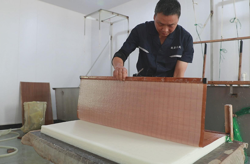 徽州楮皮紙起源于北宋,是利用當地特有的楮皮制作出適合書畫使用的一種紙品。2003年,非遺傳承人朱建新創辦公司,致力于徽州楮皮紙的傳承和發展。2018年徽州楮皮紙被錄入中國手工紙文庫,2019年徽州楮皮紙制作技藝成為了黃山市非遺傳承項目。 徽州楮皮紙的制作主要分為6個步驟,揀料:去除黃莖